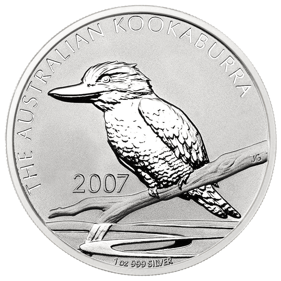 The reverse of the coin shows a kookaburra bird perched on a tree branch, above a swirl of water. The reverse also features the inscriptions “THE AUSTRALIAN KOOKABURRA” and “1OZ 999 SILVER”, as well as the 2007 year-date.