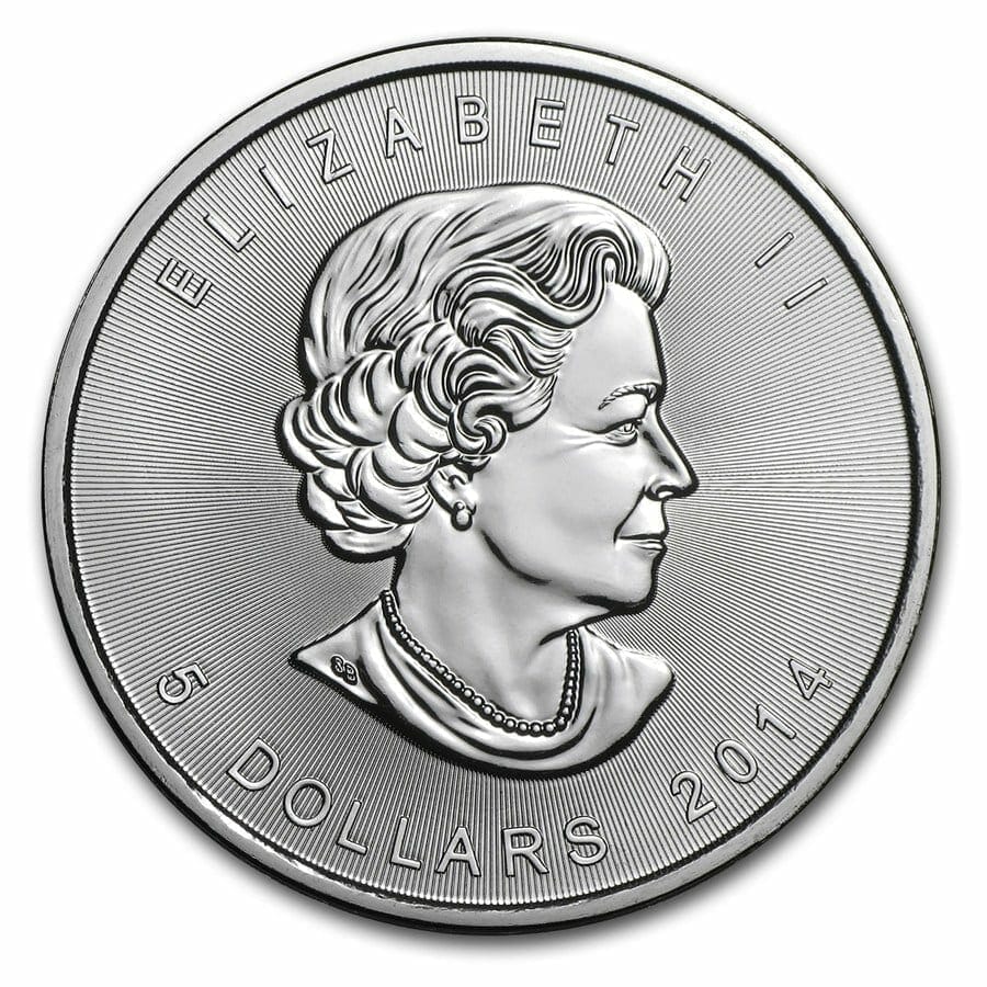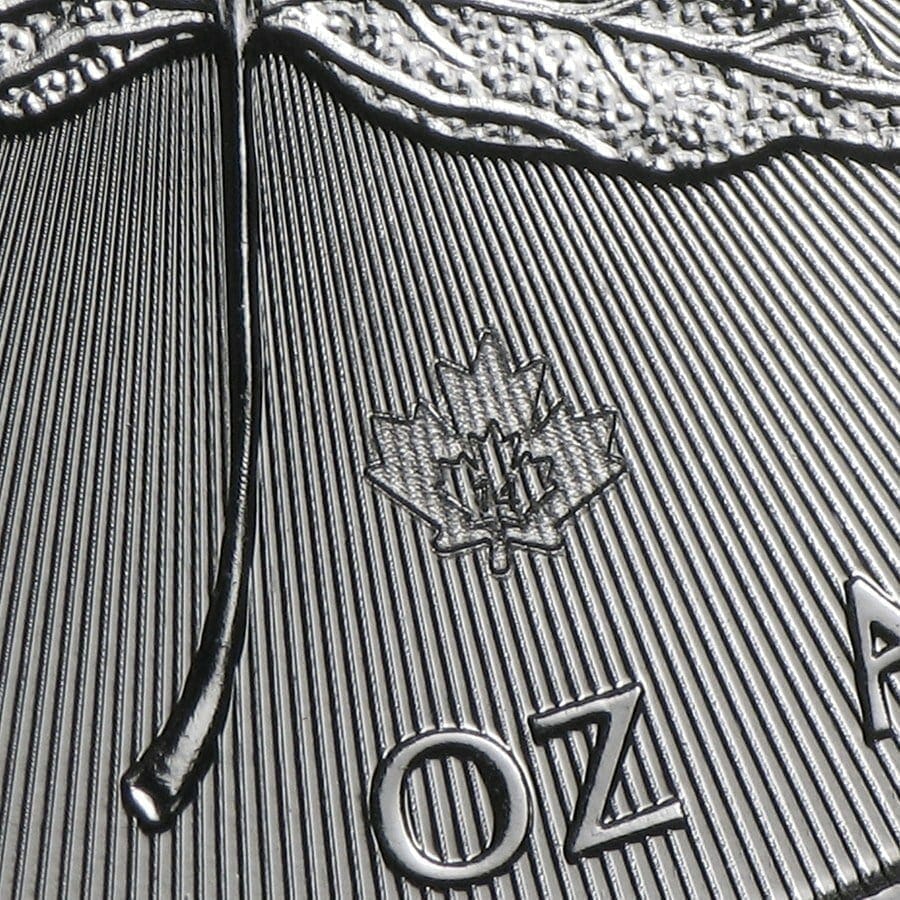 - Reverse: Displays a large, single maple leaf with the weight and purity. Contains a micro-engraved maple leaf privy mark that shows a “14” when viewed under magnification.