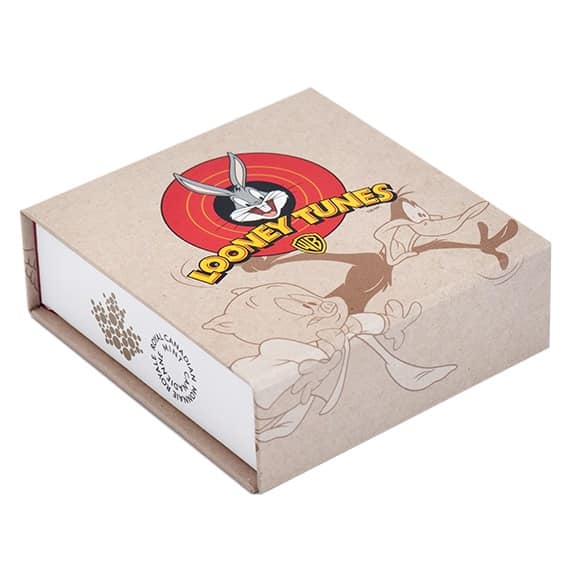 The reverse image, provided by Warner Bros., features a group portrait of several Looney Tunes characters peering out from a circular enclosure.