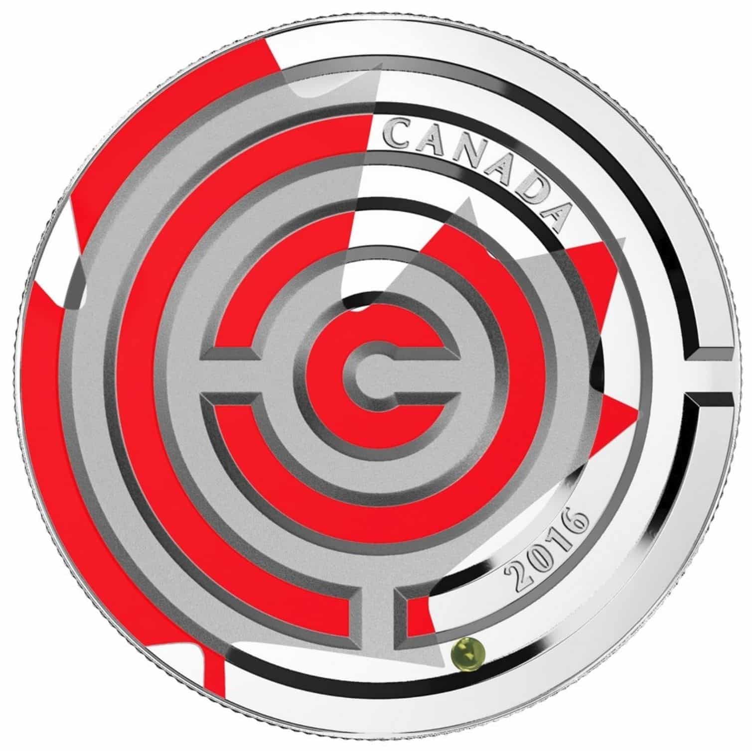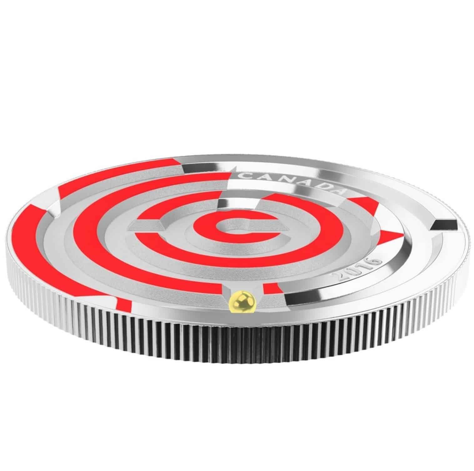 The reverse design brings together the use of colour, precision engraving and an innovative design to create a one-of-a-kind numismatic maze. A small brass ball rolls freely along the engraved circular pathway that forms the maze, while multiple paths provide the challenge of getting the ball to the bull’s eye in the centre of the reverse. In the background is a partial view of a Canadian icon that is recognised worldwide: the beautiful red maple leaf that proudly adorns our national flag.