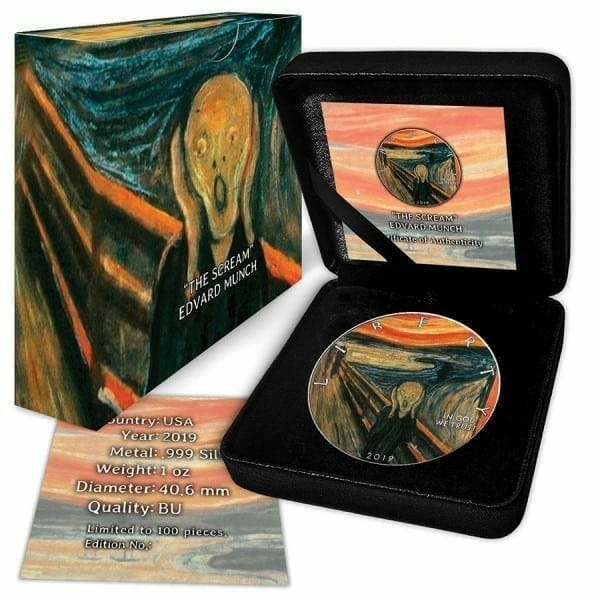 Your coin is displayed elegantly in a black case that fits inside a “The Scream” themed box. It is accompanied by a numbered certificate of authenticity, limited at only 100 pieces world wide.
