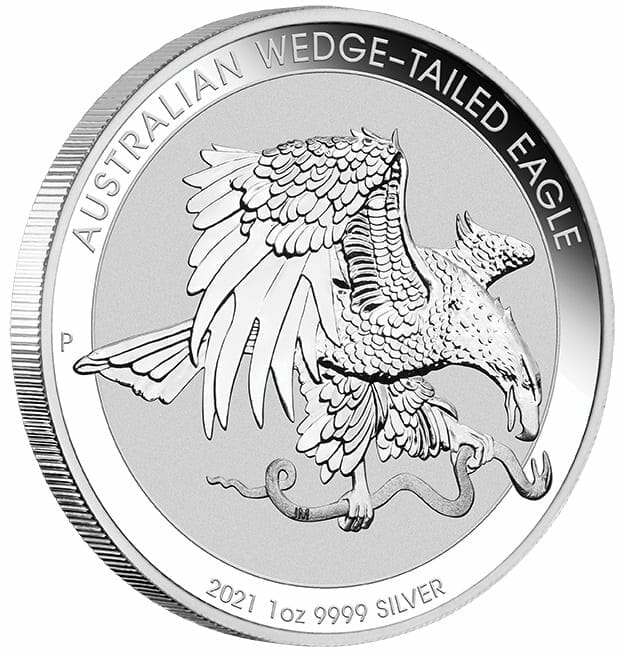 The Australian Wedge-Tailed Eagle 2021 1oz Silver Bullion Coin is struck by The Perth Mint from 99.99% pure silver and issued as legal tender under the Australian Currency Act 1965.