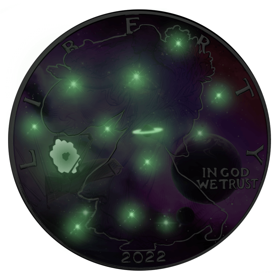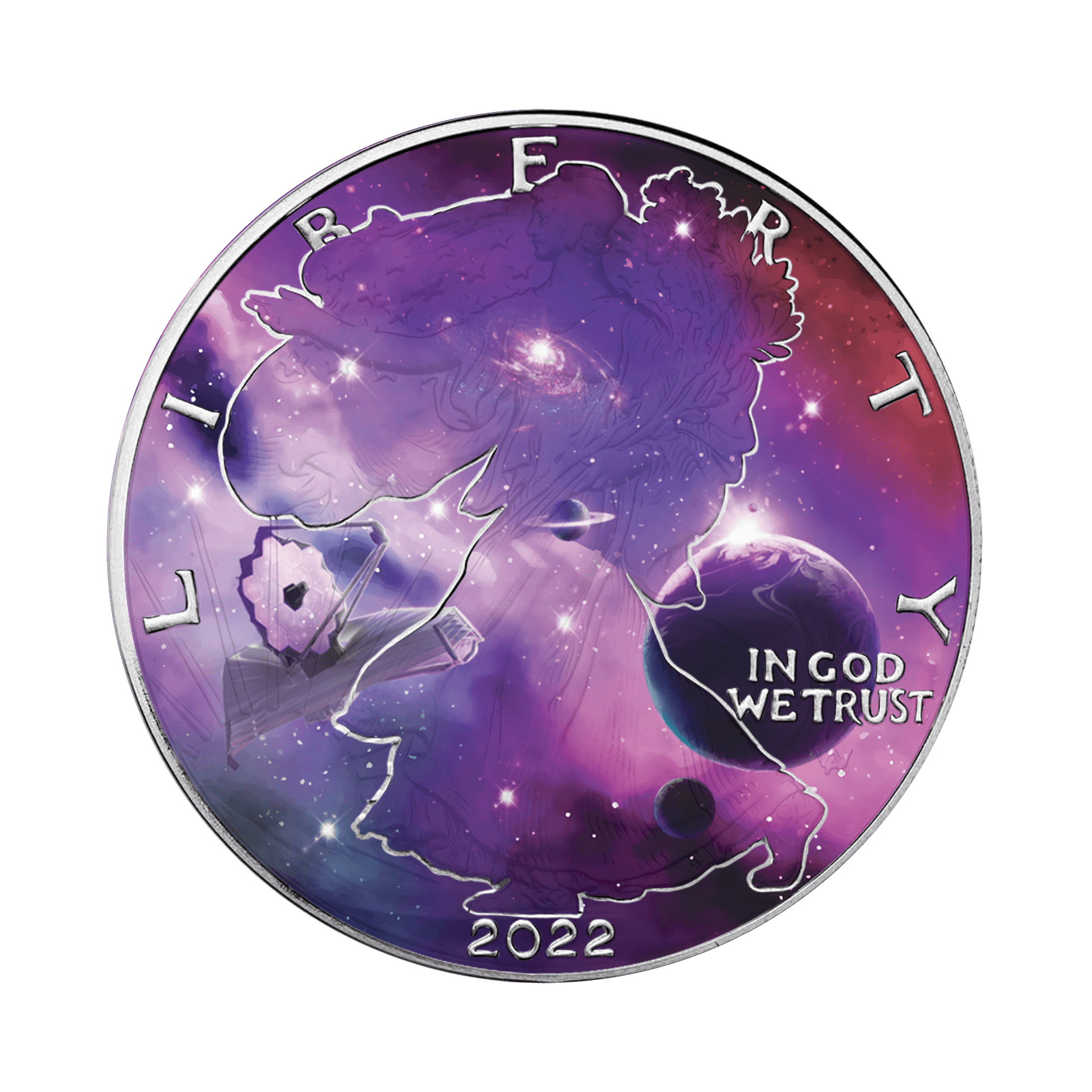 The obverse features an interstellar motif with various galaxies and stars in the distance. The newly launched James Webb Telescope can be seen off to the left and there is a white outline of the original Walking Liberty design in the middle. The reverse also features the inscriptions “LIBERTY”, “IN GOD WE TRUST” and the 2022 year-date.