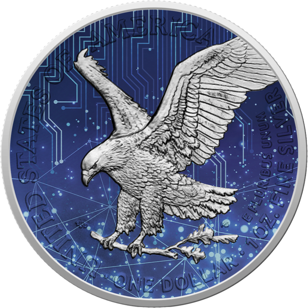 The reverse shows the new 2021 design of an eagle coming in for a landing, carrying an oak branch. The background maintains the space blue colour and circuitry theme. The reverse is inscribed with the phrases “UNITED STATES OF AMERICA”, “1 OZ. FINE SILVER” and “ONE DOLLAR”.