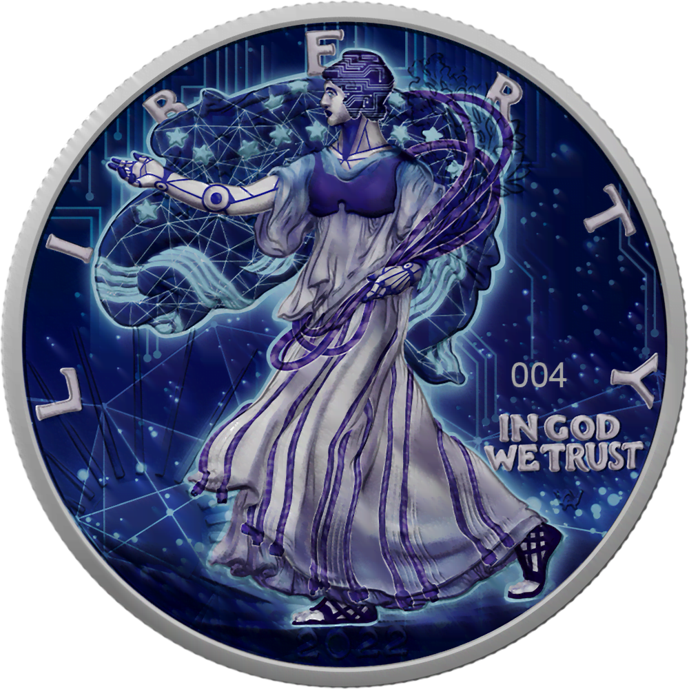 The obverse features a blend of blues and silvers. The obverse also features the inscriptions “LIBERTY”, “IN GOD WE TRUST” and the 2022 year-date. Walking Liberty is given a robotic appearance with a circuitry to continue that artificial intelligence theme .