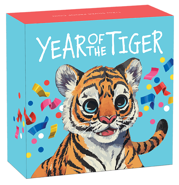 The coin’s reverse depicts a coloured representation of a cute tiger cub embracing a gift-wrapped parcel with representations of party confetti in the background. The Chinese character for ‘tiger’, the inscription ‘YEAR OF THE TIGER’ and The Perth Mint’s ‘P’ mintmark are also incorporated into the design.