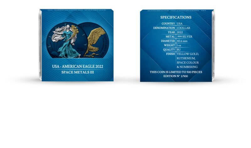 The obverse features a blend of gold and space blue colourisation. The obverse also features the inscriptions “LIBERTY”, “IN GOD WE TRUST” and the 2022 year-date.