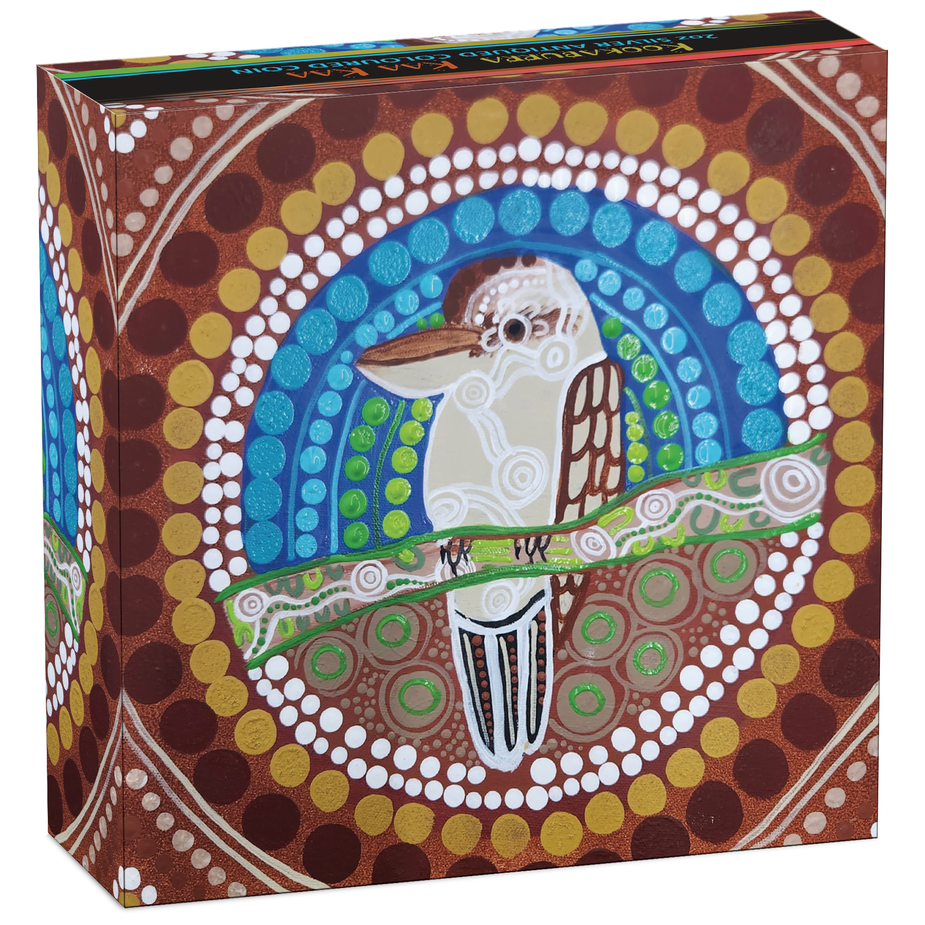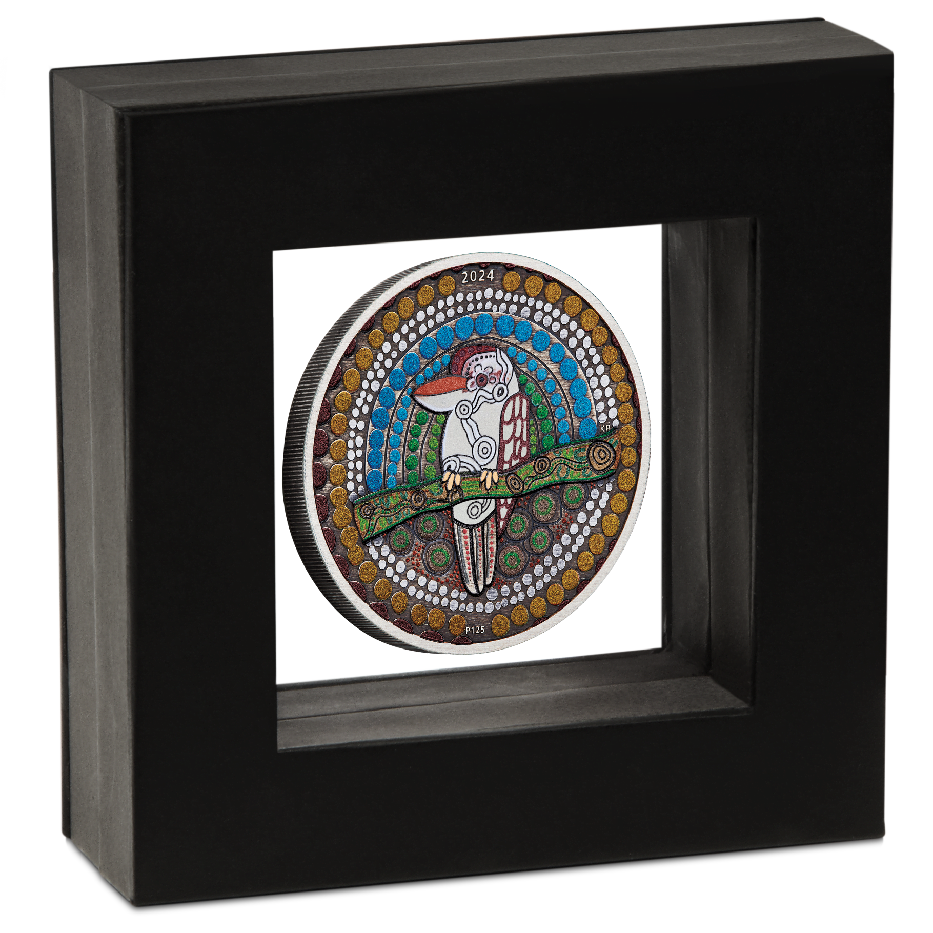 A stunning example of his technique, the kookaburra features markings symbolising white ochre, a natural earth pigment with which ancestors painted themselves when performing the kookaburra Dreaming dance. The background comprises coloured dots – shades of blue representing the morning, day, and evening sky; green denoting leaves during the Djeran season (April/May), and brown during the Kambarang, Birak and Bunuru seasons (October/March). Included in the design is a ‘P125’ mintmark, signifying The Perth Mint’s 125th anniversary, and the 2024 year-date.