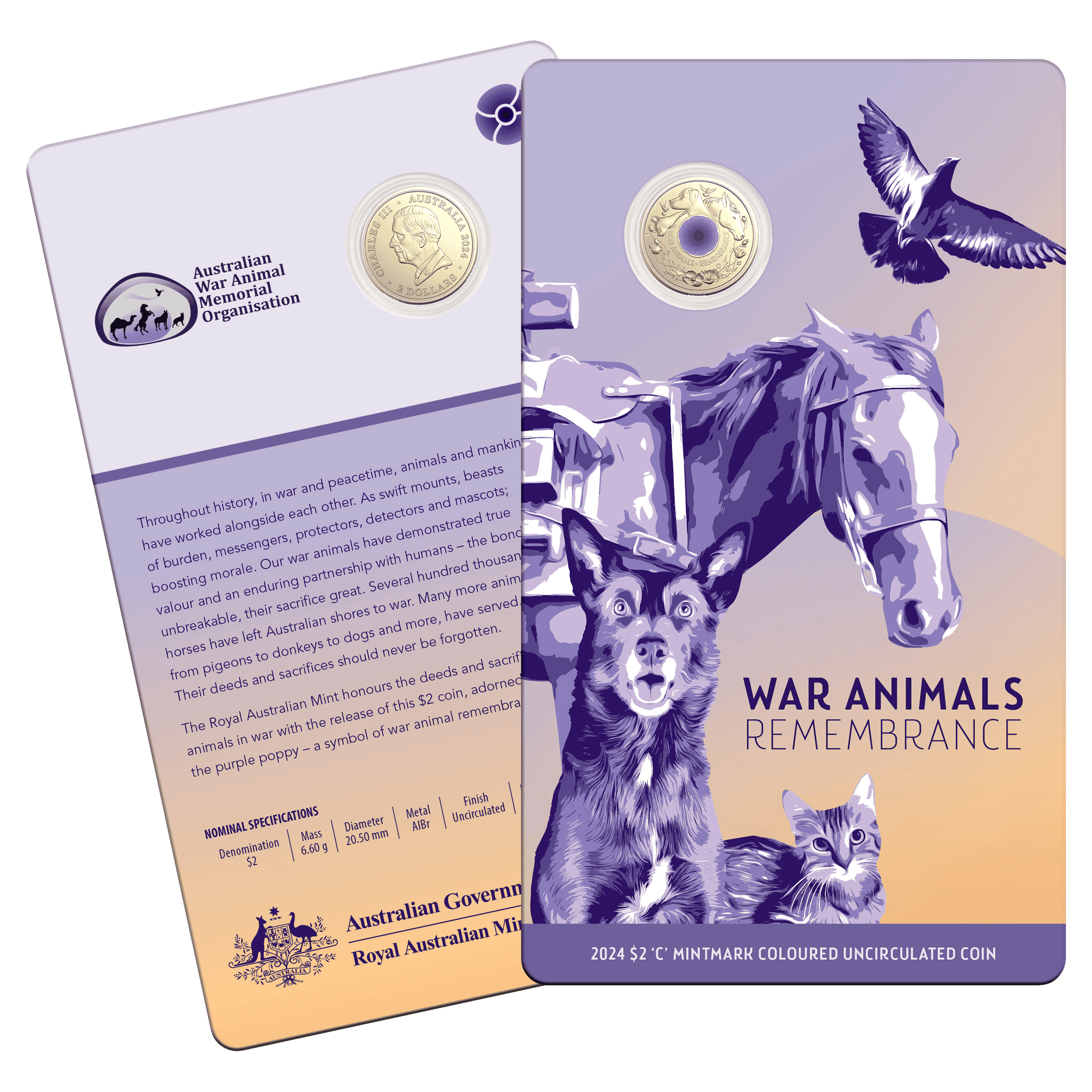 Each coin comes encapsulated and presented in a unique purple War Animals Remembrance presentation card.