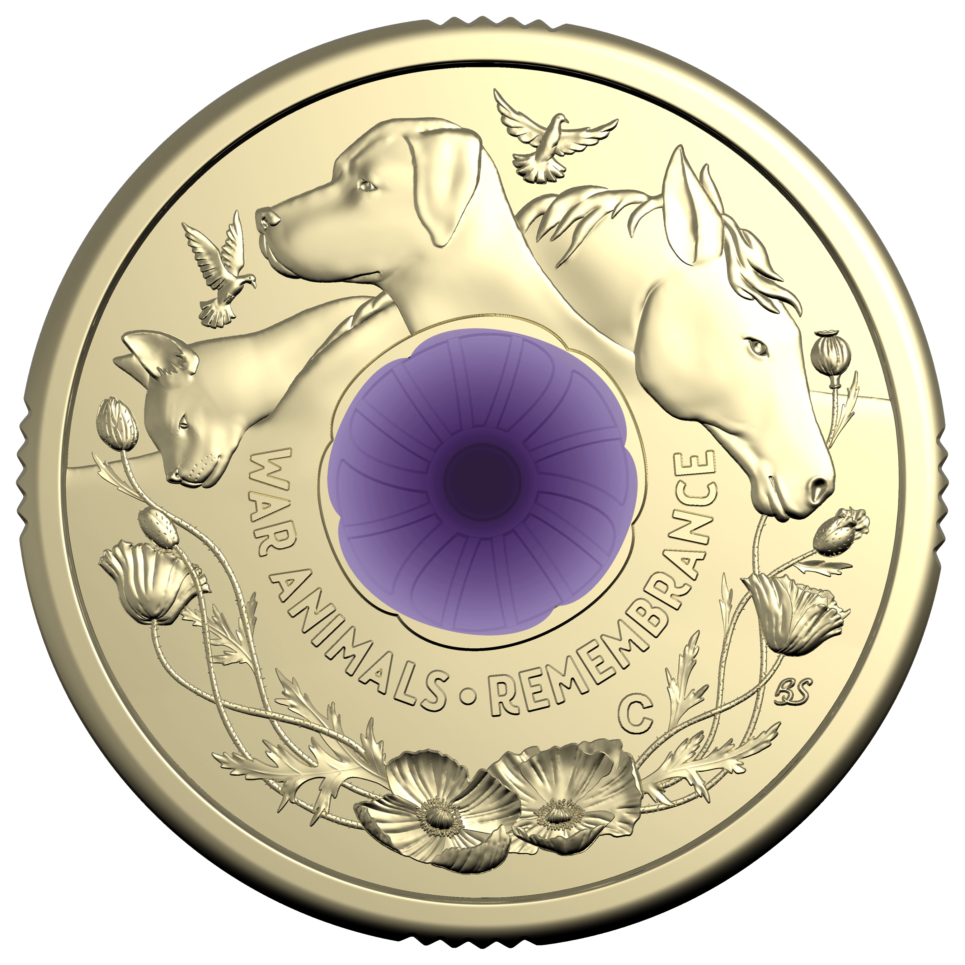 The reverse of the coin features a ‘C’ mintmark and iconic poppy print in purple, bordered by depictions of Australia’s war animals. Includes the inscription “WAR ANIMALS REMEMBRANCE”.