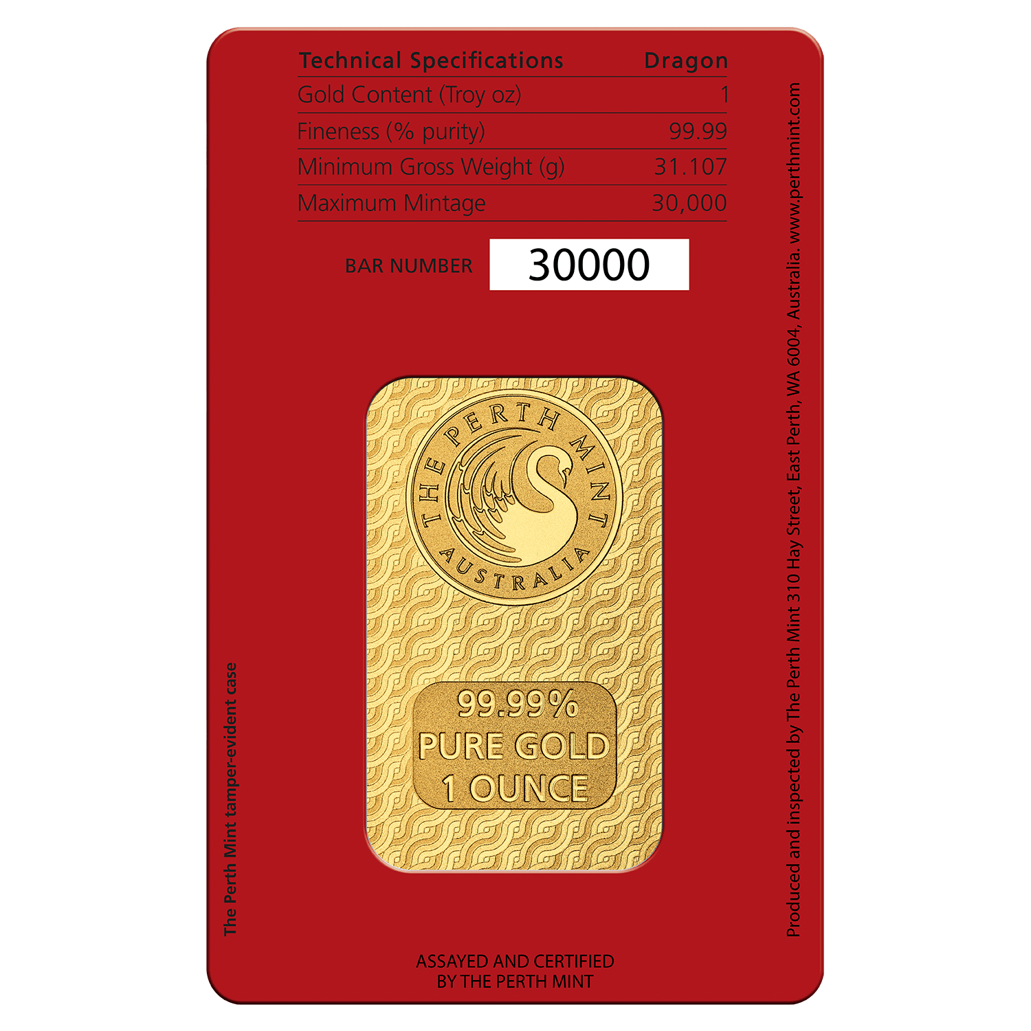 Manufactured from 1oz of 99.99% pure gold by the world-renowned Perth Mint, this 1oz Lunar Minted Gold Bar has a maximum mintage of 30,000.