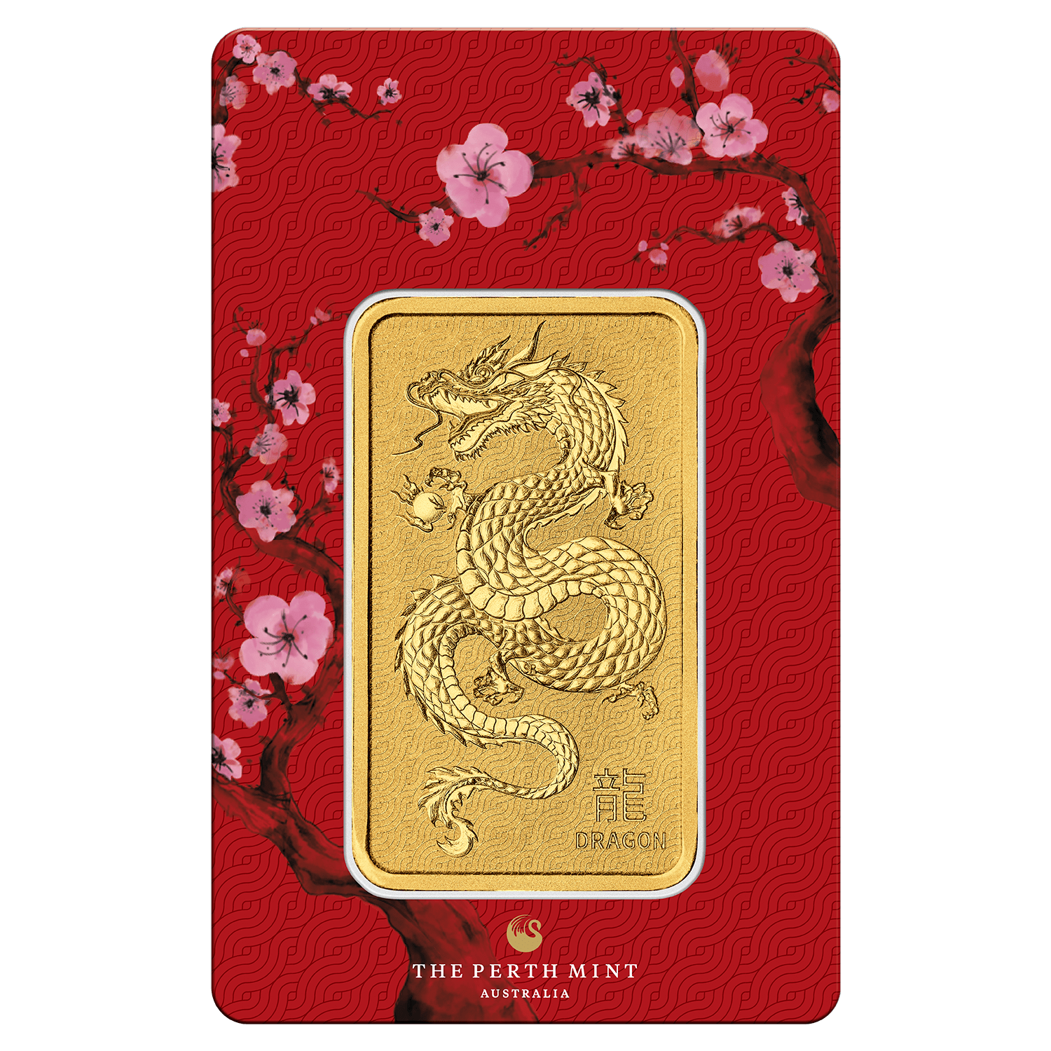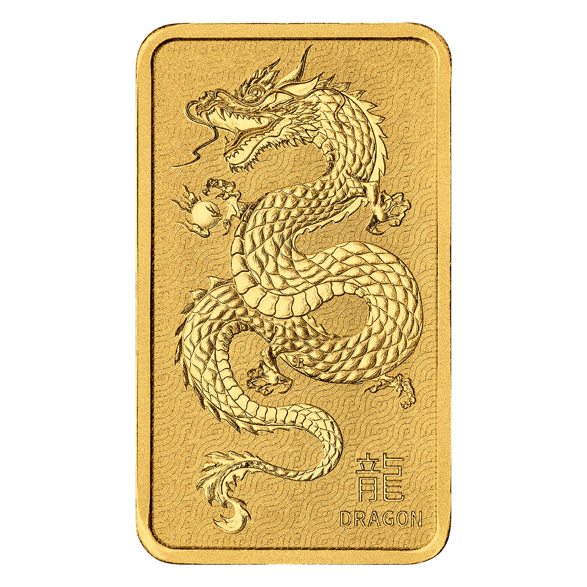 This carefully crafted pure gold bar features a minted impression of a lunar dragon on a patterned background. The sinuous, heavily-scaled creature is about to grasp a flaming pearl, a symbol of wisdom. Included in the design is the inscription ‘DRAGON’ and the Chinese character for dragon.