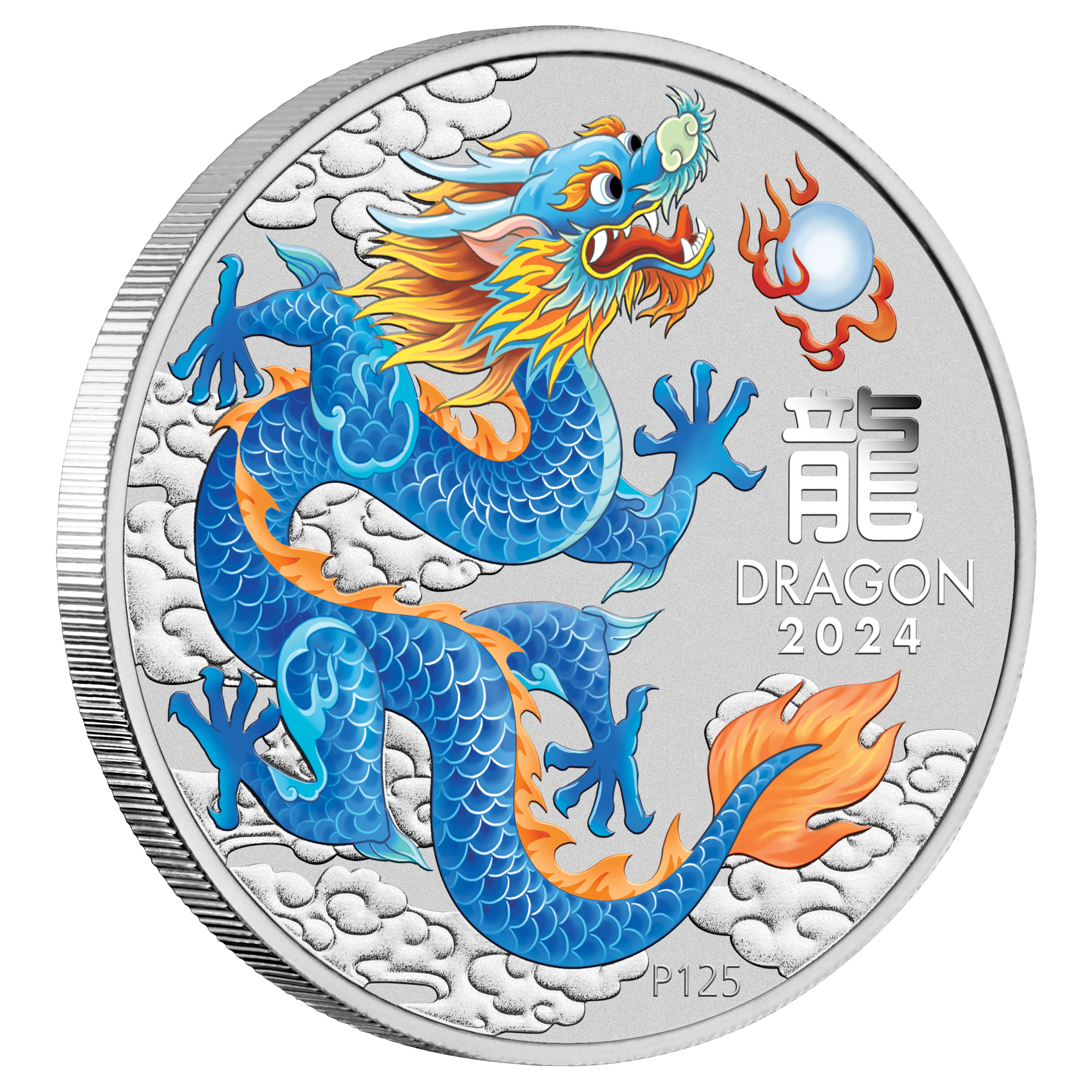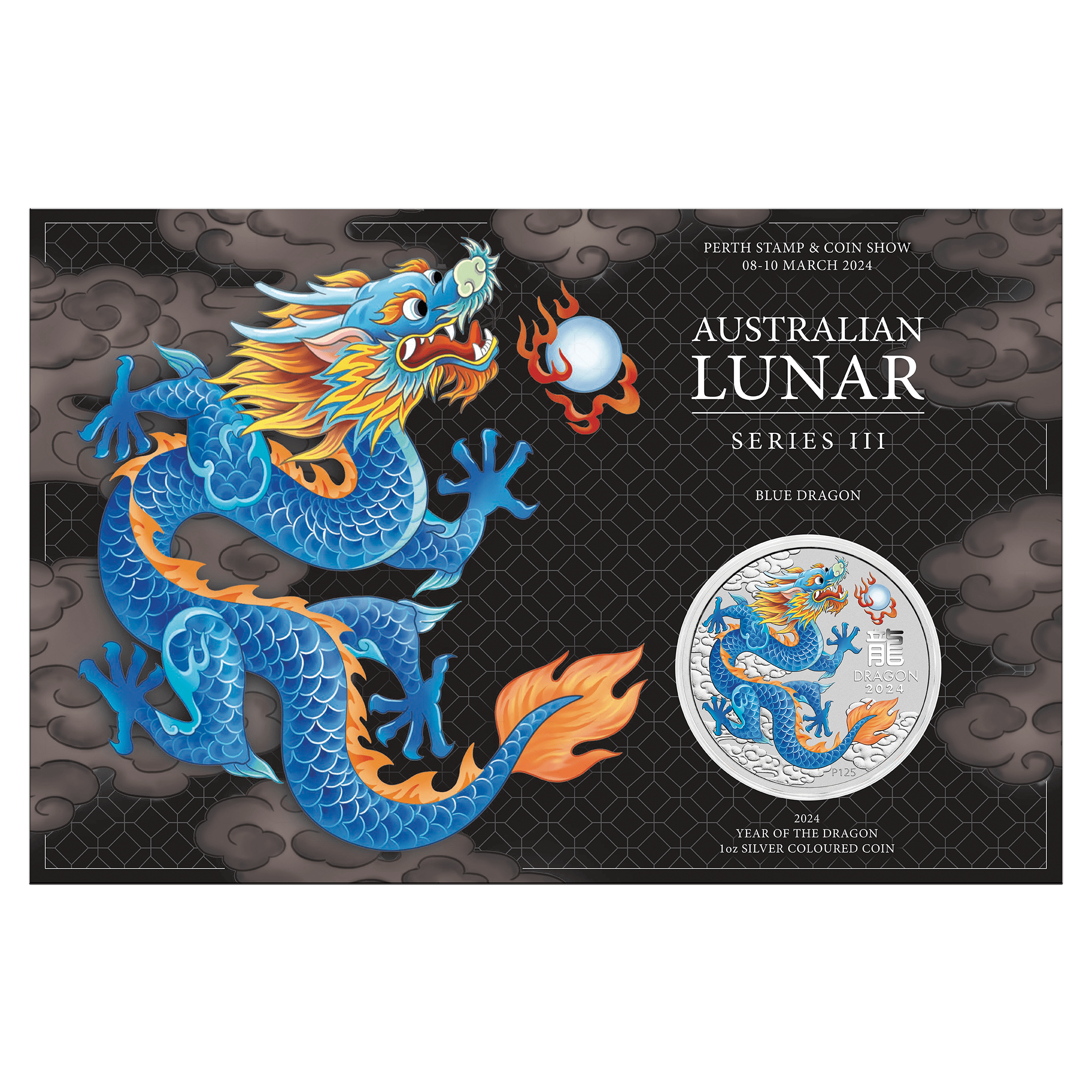 The Perth Mint will release no more than 5,000 of the Perth Stamp and Coin Show Special Australian Lunar Series III Blue Dragon 2024 Year of the Dragon 1oz Silver Coloured Coin in Card in individual packaging from a maximum mintage of 200,000.