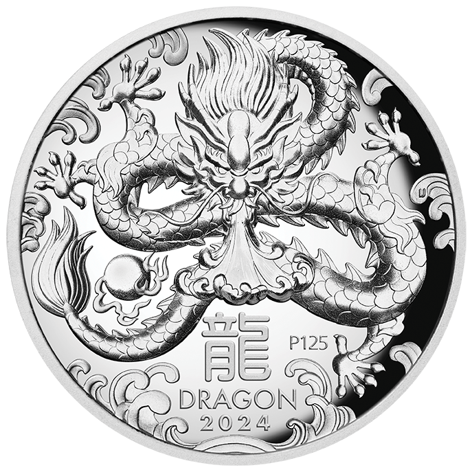 The coin’s reverse portrays a dragon with water cascading from its mouth, stylised waves, and a flaming pearl, a symbol of wisdom. Included in the design is the Chinese character for ‘dragon’, the inscription ‘DRAGON 2024’ and a ‘P125’ mintmark signifying The Perth Mint’s 125th anniversary.