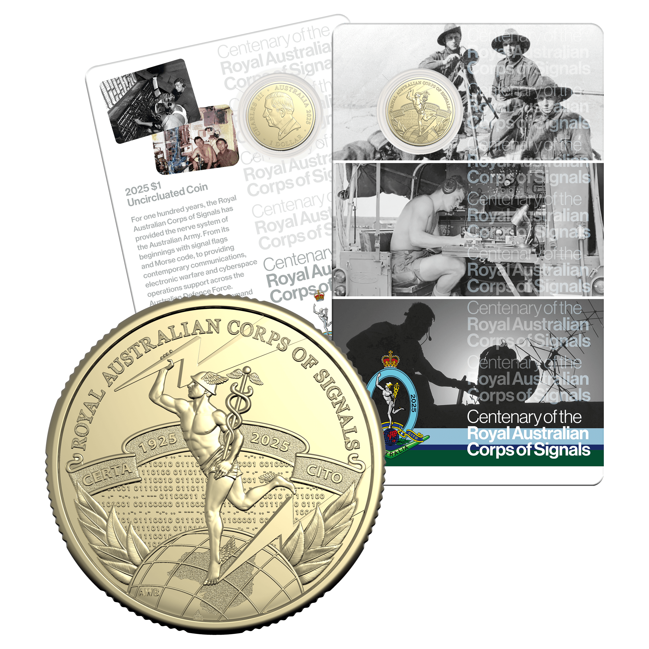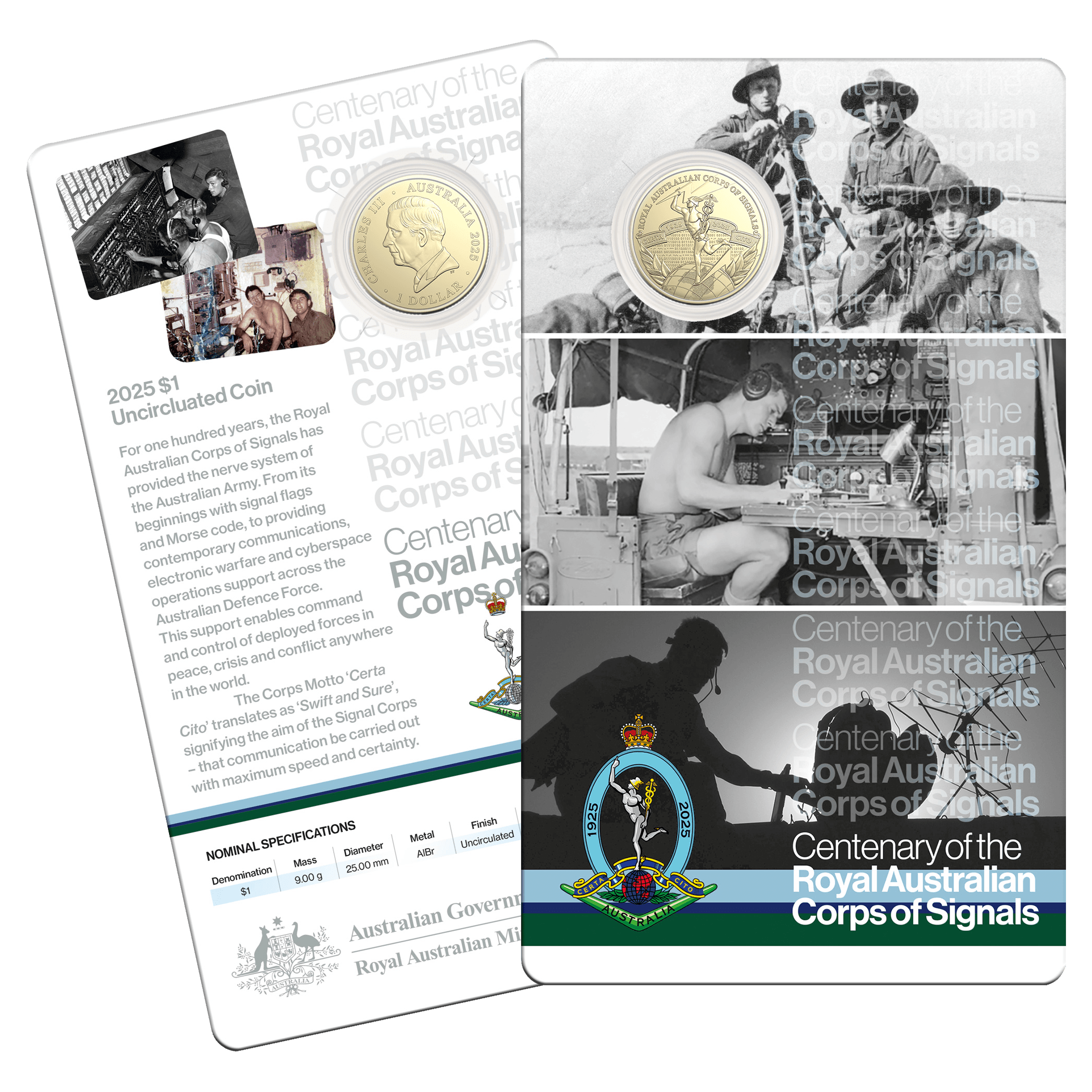 Each coin is presented in a Royal Australian Corps of Signals themed presentation card.