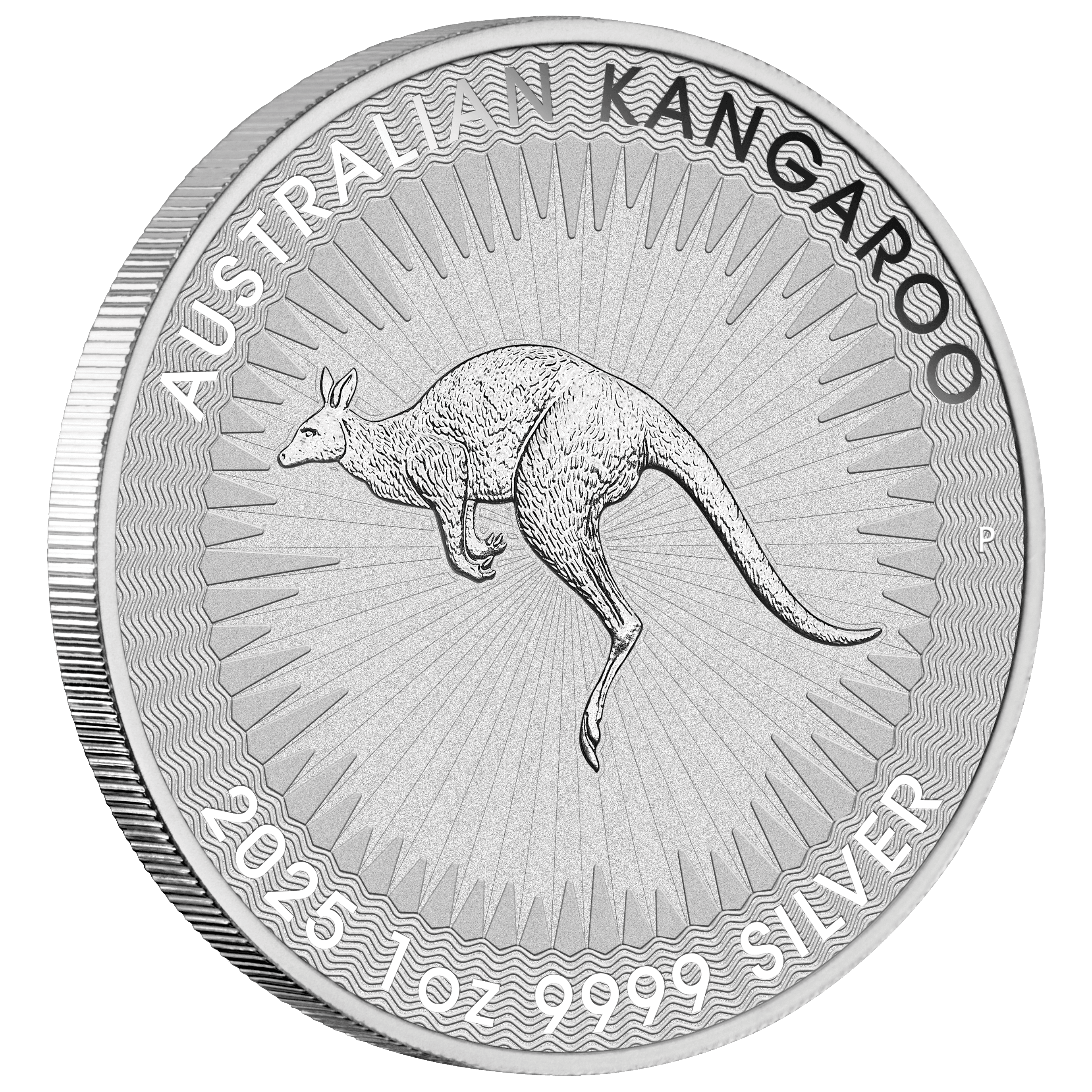 The reverse of the silver kangaroo coin depicts a bounding kangaroo surrounded by stylised rays of sunlight. Inscriptions on a wavy-lined border include ‘AUSTRALIAN KANGAROO’ and the coin’s weight, purity, the 2025 year-date, and The Perth Mint’s ‘P’ mintmark.
