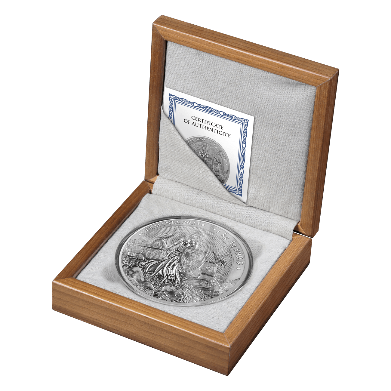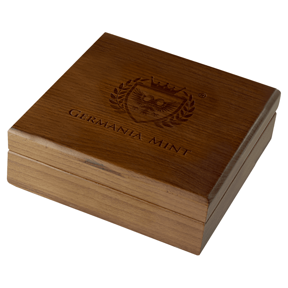 Each coin is provided in an individual protective capsule that is shipped in a protective cardboard shipper. Every 1kg coin is accompanied by an elegant Germania Mint wooden box and numbered certificate of authenticity (that matches the engraving on the coin) that fits inside of a black sleeve shipper.