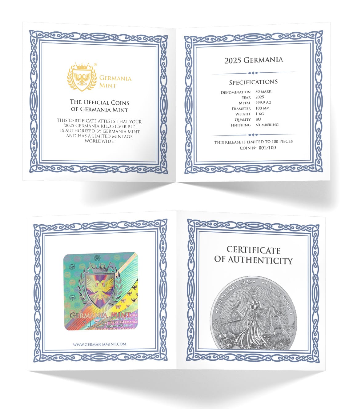 Minted from 1 kilo of 99.99% pure silver, Germania Mint will produce no more than 100 of 2025 Germania 1kg silver coins.