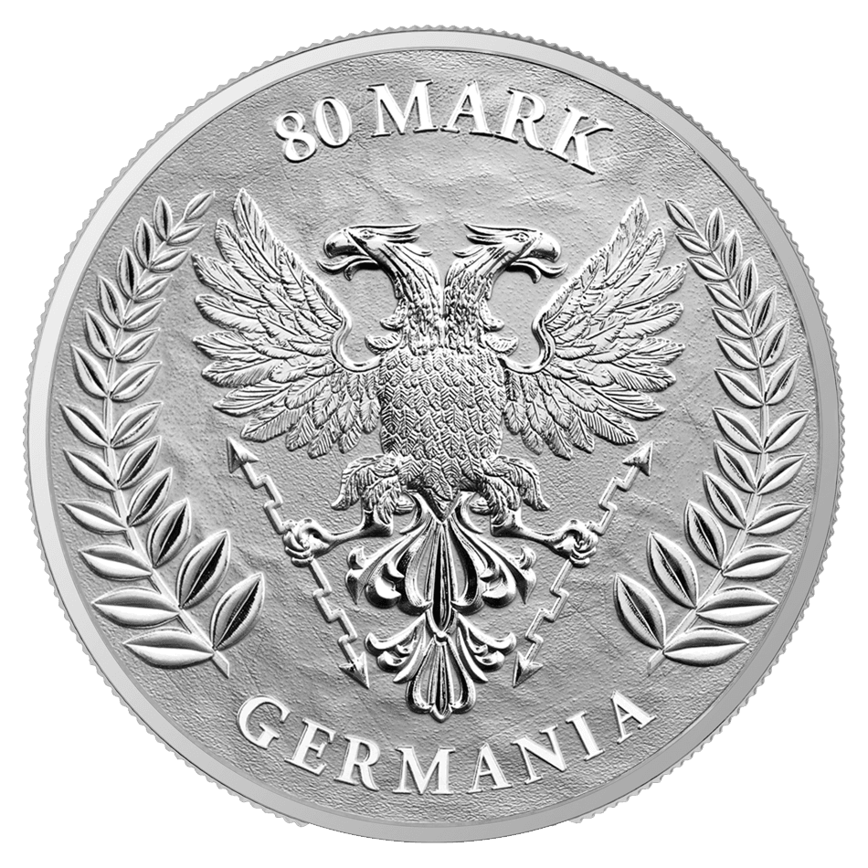 The reverse of the coin features the Germania Mint coat of arms, with a two-headed eagle holding lightning bolts and surrounded by olive branches. The eagle is derived from Germanic mythology, associated with Janus – the god of all beginnings, guardian of gates and bridges, and patron of alliances. The eagle’s heads, facing in opposite directions, symbolize the past and the future.