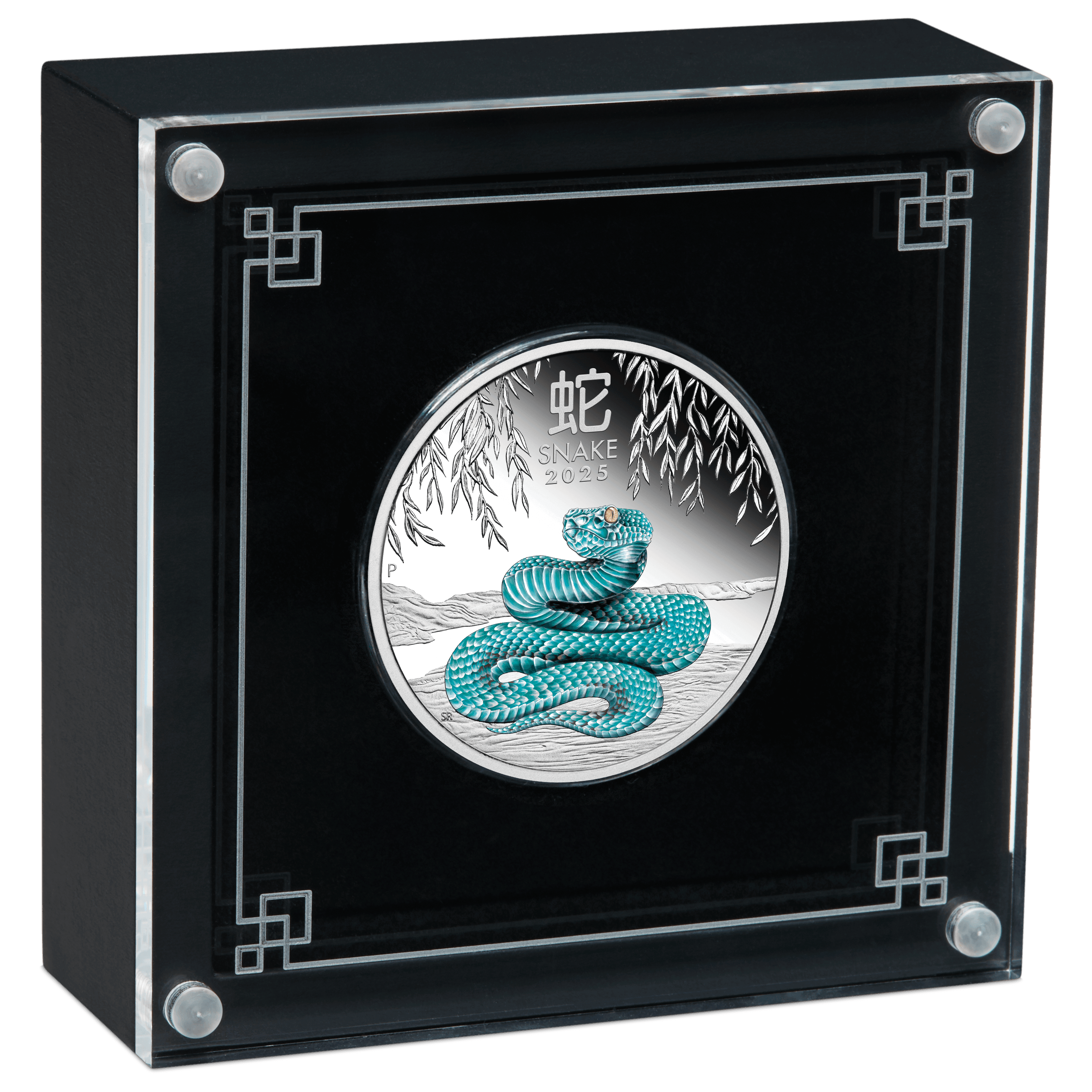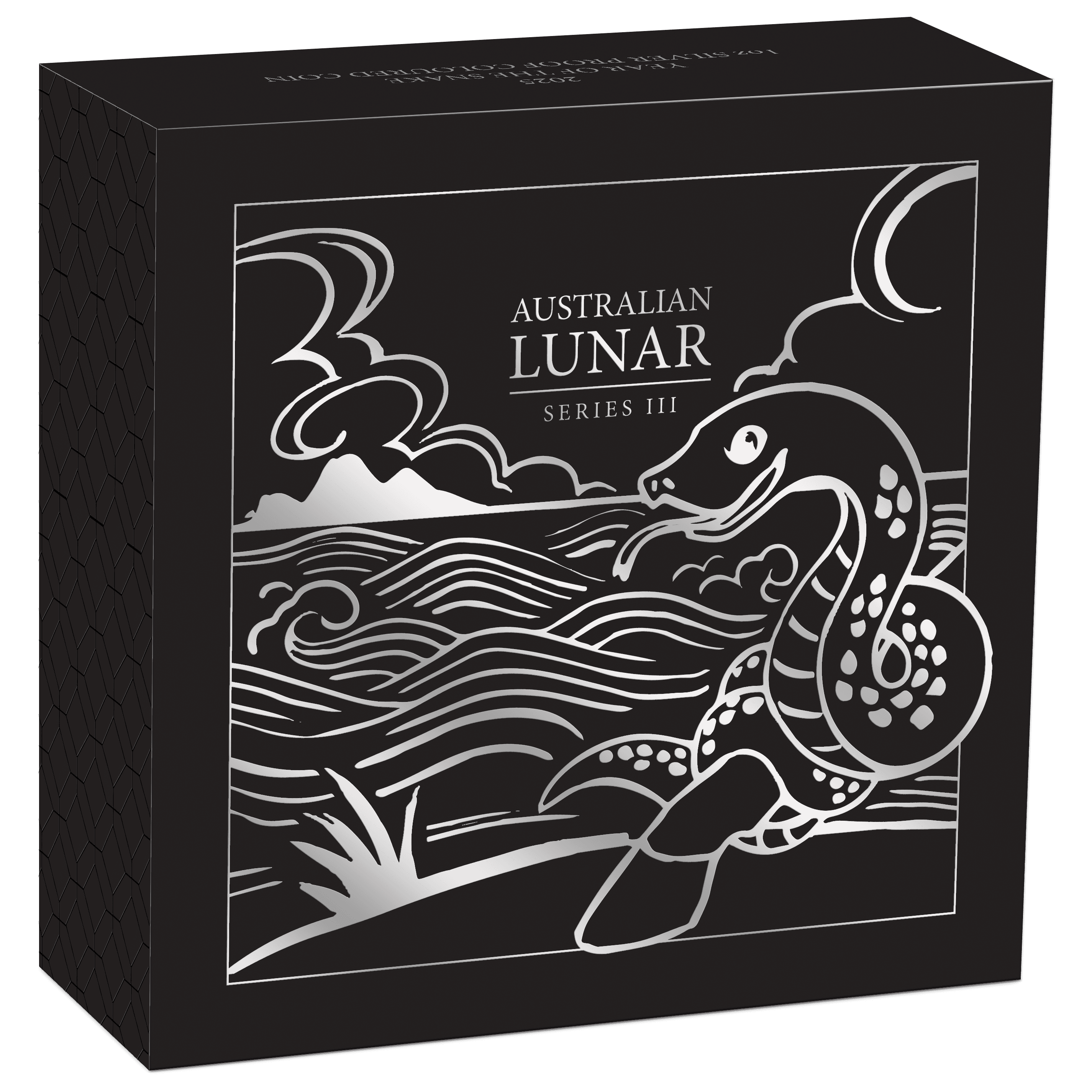 The Perth Mint will release no more than 6,000 of the Australian Lunar Series III 2025 Year of the Snake 1oz Silver Proof Coloured Coin in this packaging out of a mintage of 7,500.
