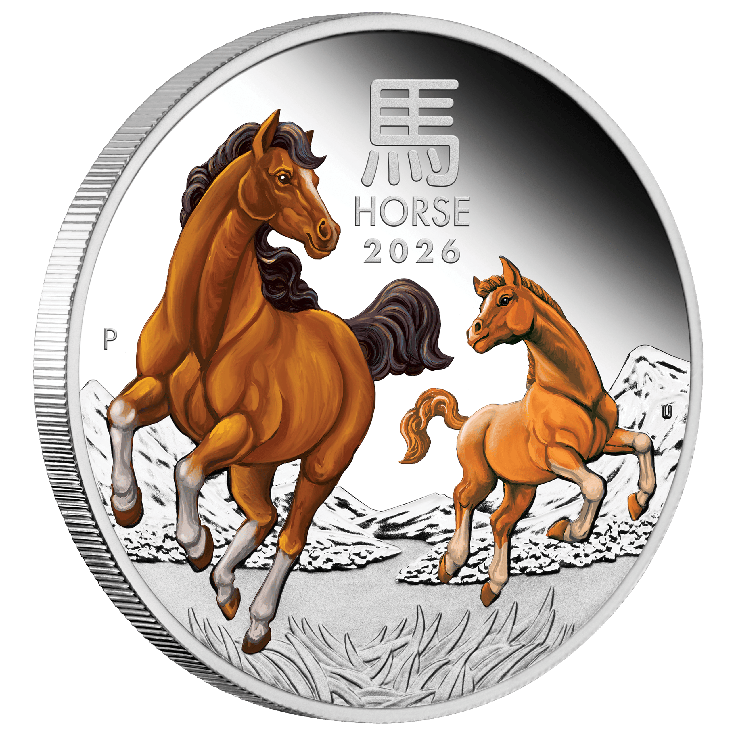 The coin’s reverse portrays a coloured representation of a majestic mare alongside her young foal, both depicted with elegant manes in a striking galloping stance. The background includes an image of mountainous landscapes and grassland. Included in the design is the Chinese character for ‘Horse’, the inscription ‘HORSE 2026’, and The Perth Mint’s ‘P’ mintmark.