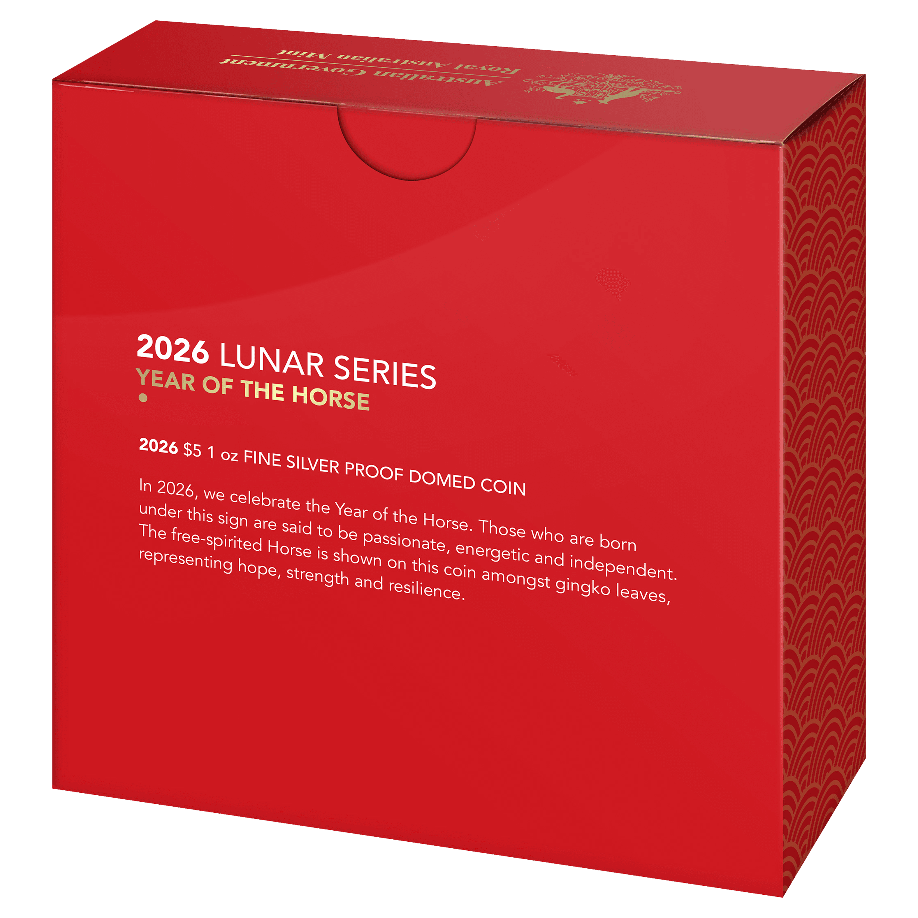 To celebrate the Lunar Year of the Horse, the Royal Australian Mint is releasing this 2026 $5 Fine Silver Proof Domed Coin. Lunar New Year is celebrated across the world, with coins considered auspicious gifts. Featuring the lively and adventurous Horse on the reverse and the lunar calendar wheel on the obverse, this coin is an ideal gift or collectible.