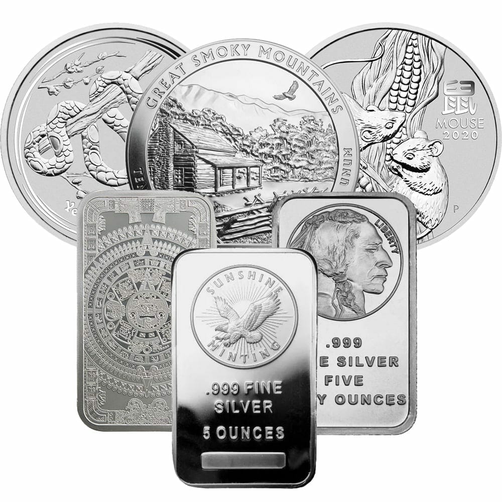 Assorted 5oz silver coins or bars provided from the secondary market. Secondary market product may be chosen from a pool of new products or buy backs that have been verified. At minimum, the bars or coins on offer will be 5oz of silver and of 99.9% purity. The most cost effective way to invest into physical bullion.