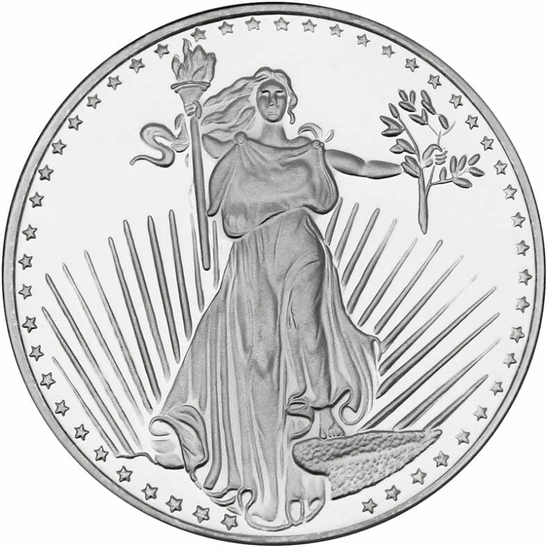 Augustus Saint-Gaudens (last name is also refered to as “St Gaudens”) is widely known for designing the twenty-dollar gold coin minted from 1907-1933. This replica silver medallion is modeled after Augustus’ original striding-Liberty design which was is now currently used on modern American Gold Eagle Bullion coins.