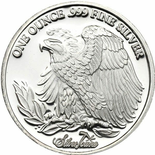 The obverse design features a likeness of lady liberty carrying a torch and olive branch with sun rays in the background and stars lining the outer edge of the medallion. The reverse design has an eagle perched on a branch with the weight and purity designation of “ONE OUNCE .999 FINE SILVER” curved around the top of the piece along with the SilverTowne trademark logo beneath the eagle’s talons.