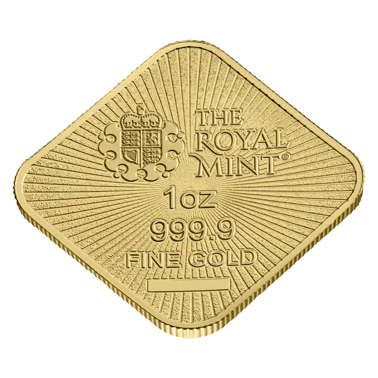 The back of the bar features The Royal Mint’s name and logo, the 1oz weight as well as the 999.9 fine gold purity. Each bar has its own unique serial number. Radial lines emanate from the middle to the edges.