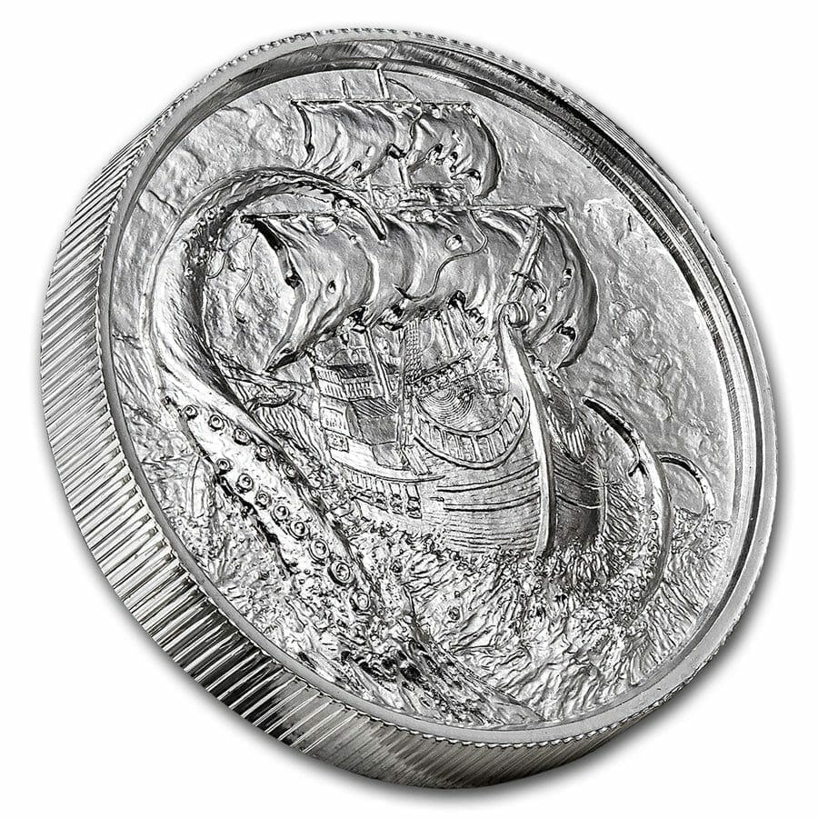 On the obverse of the 2oz Elemetal Privateer The Kraken ultra high relief silver round you’ll find the image of the kraken’s massive tentacles emerging from the water to ensnare a passing galleon. There are no engravings on this face other than the frightening image of death that comes from the kraken.