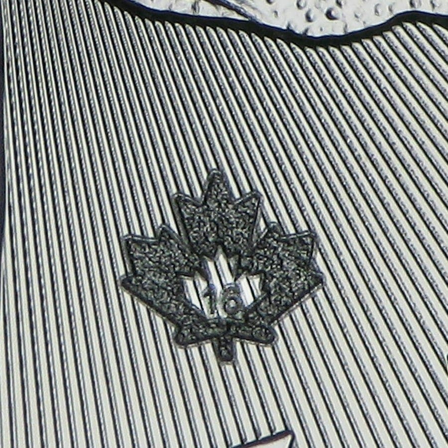 - Reverse: A large, single maple leaf with the weight and purity. New micro-engraved maple leaf privy mark shows a “16” when viewed under magnification.