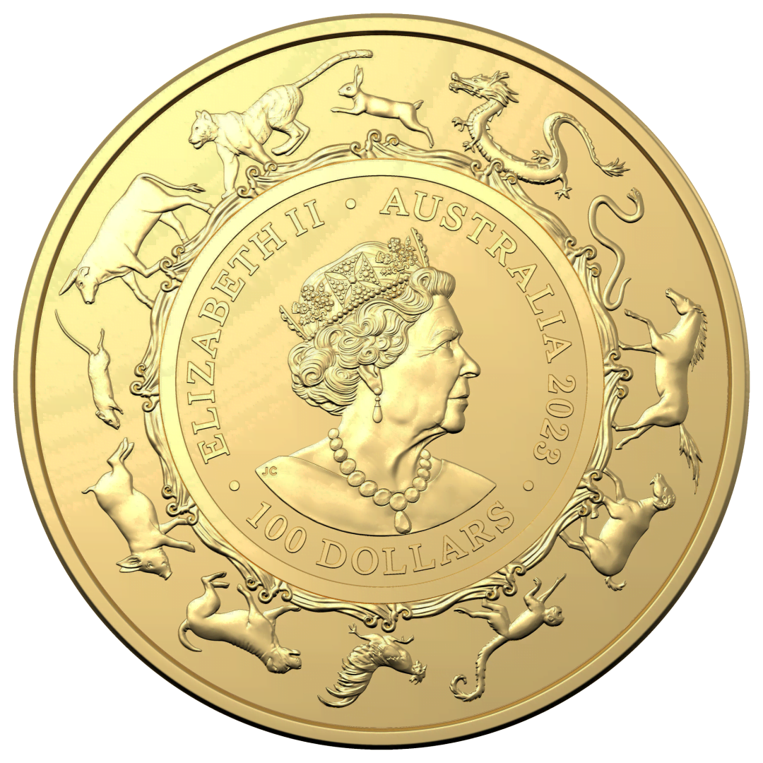 The obverse of each coin bears the Lunar calendar wheel, rotated so that the rabbit is shown at the top. It also features the effigy of Her Majesty Queen Elizabeth II designed by Jody Clark as well as the monetary denomination and 2023 year-date.