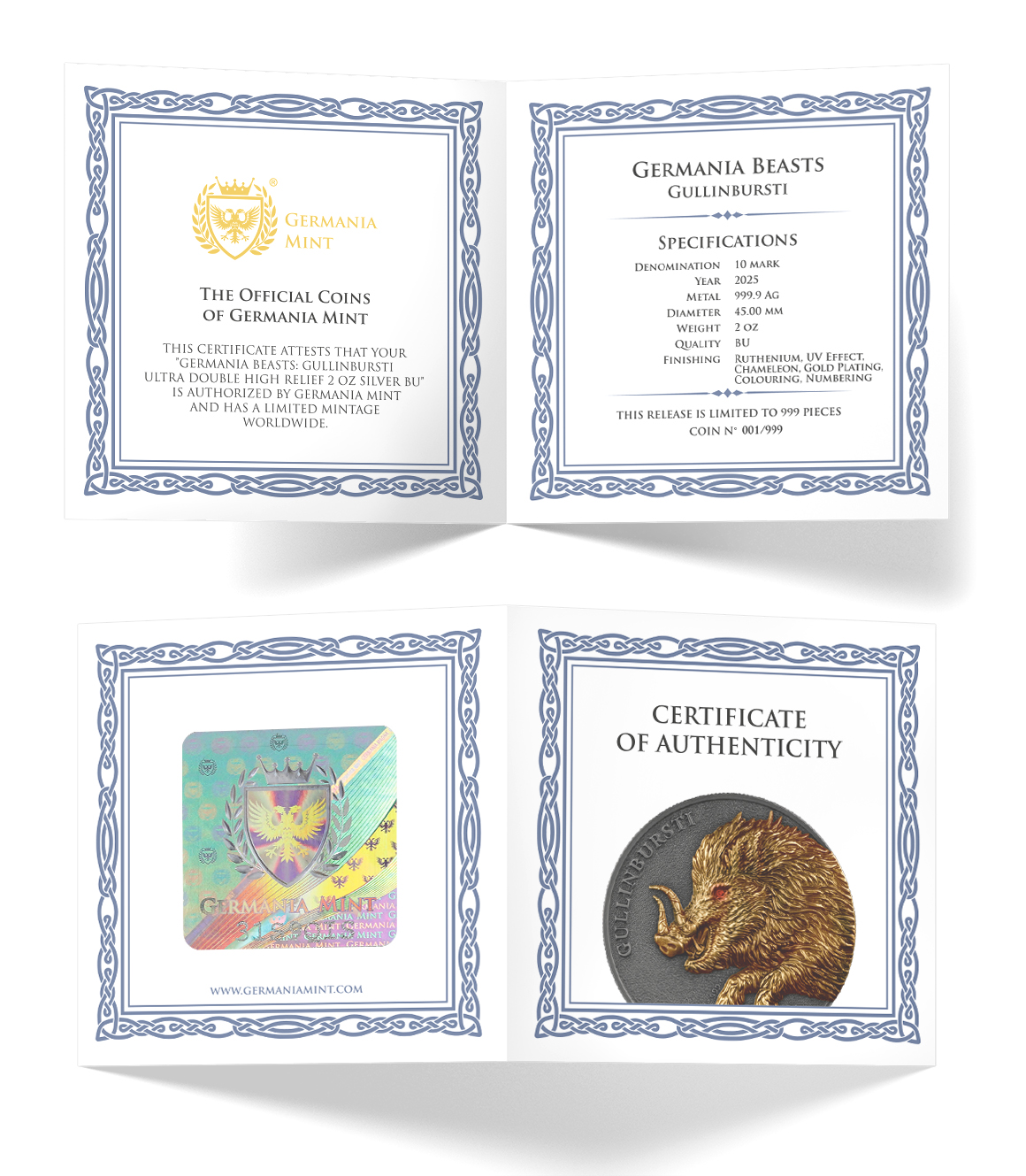 Each 2025 Germania Beasts – Gullinbursti Ultra Double High Relief 2oz silver coin is presented in a capsule inside of a specially designed acrylic display with an outer box.