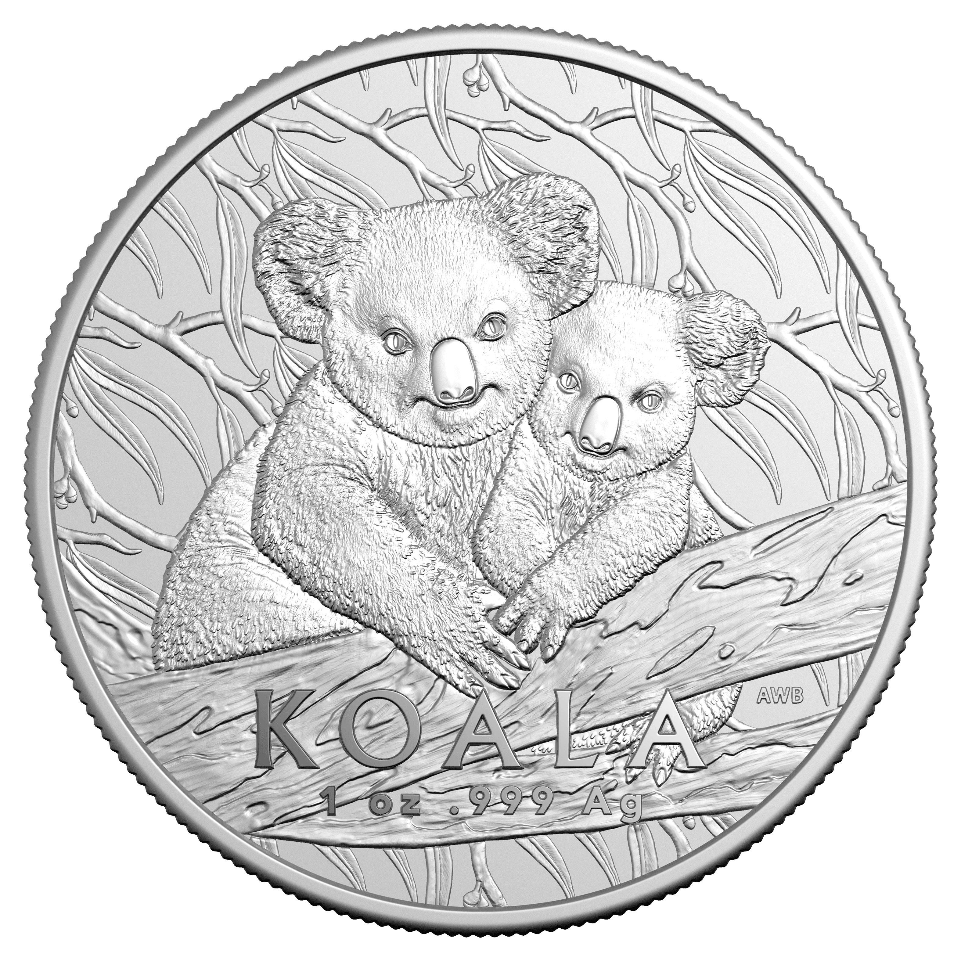 The coin’s reverse features a mother and baby koala on a tree branch, surrounded by a striking eucalyptus leaf and gum nut pattern. The reverse also includes the inscriptions “KOALA” as well as the coins weight and fineness.