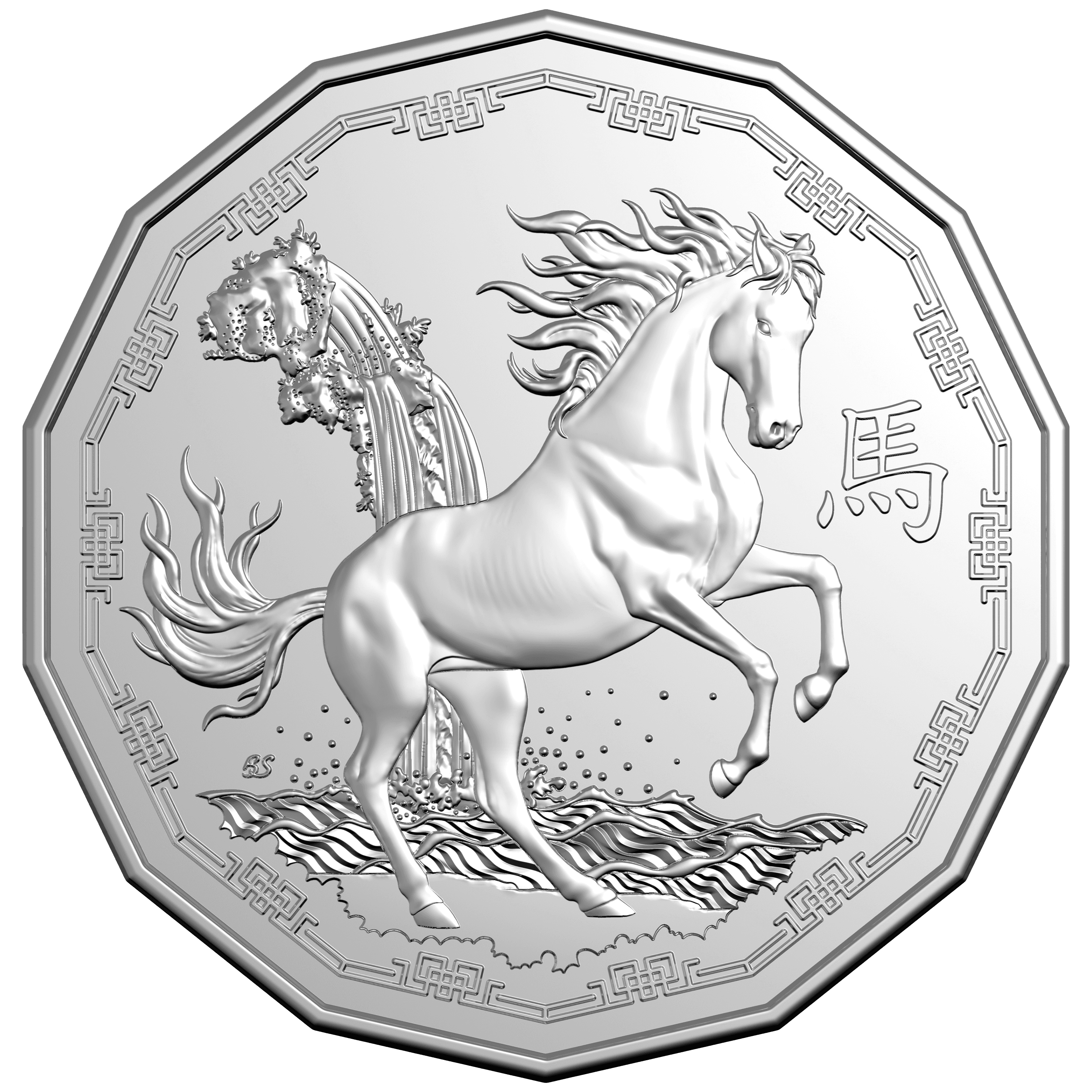The reverse features the free-spirited Lunar Horse, with waterfall and stream in the background symbolising prosperity and harmony. Also features the inscription “馬” – the traditional Chinese character for horse.