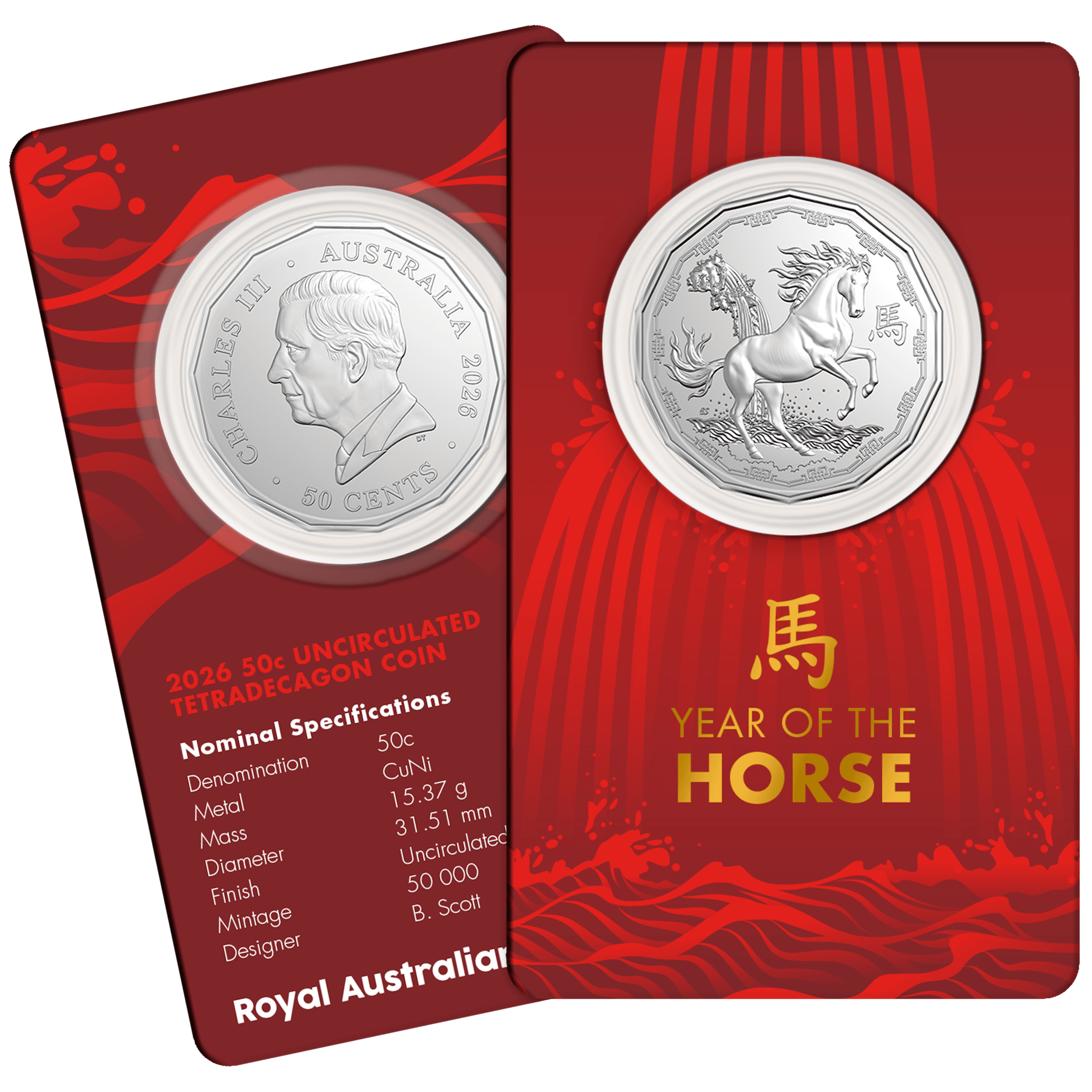 In 2026 we celebrate the Lunar Year of the Horse. This 2026 50c Uncirculated Tetradecagon Coin celebrates the Year of the Horse and all who are born under its sign.