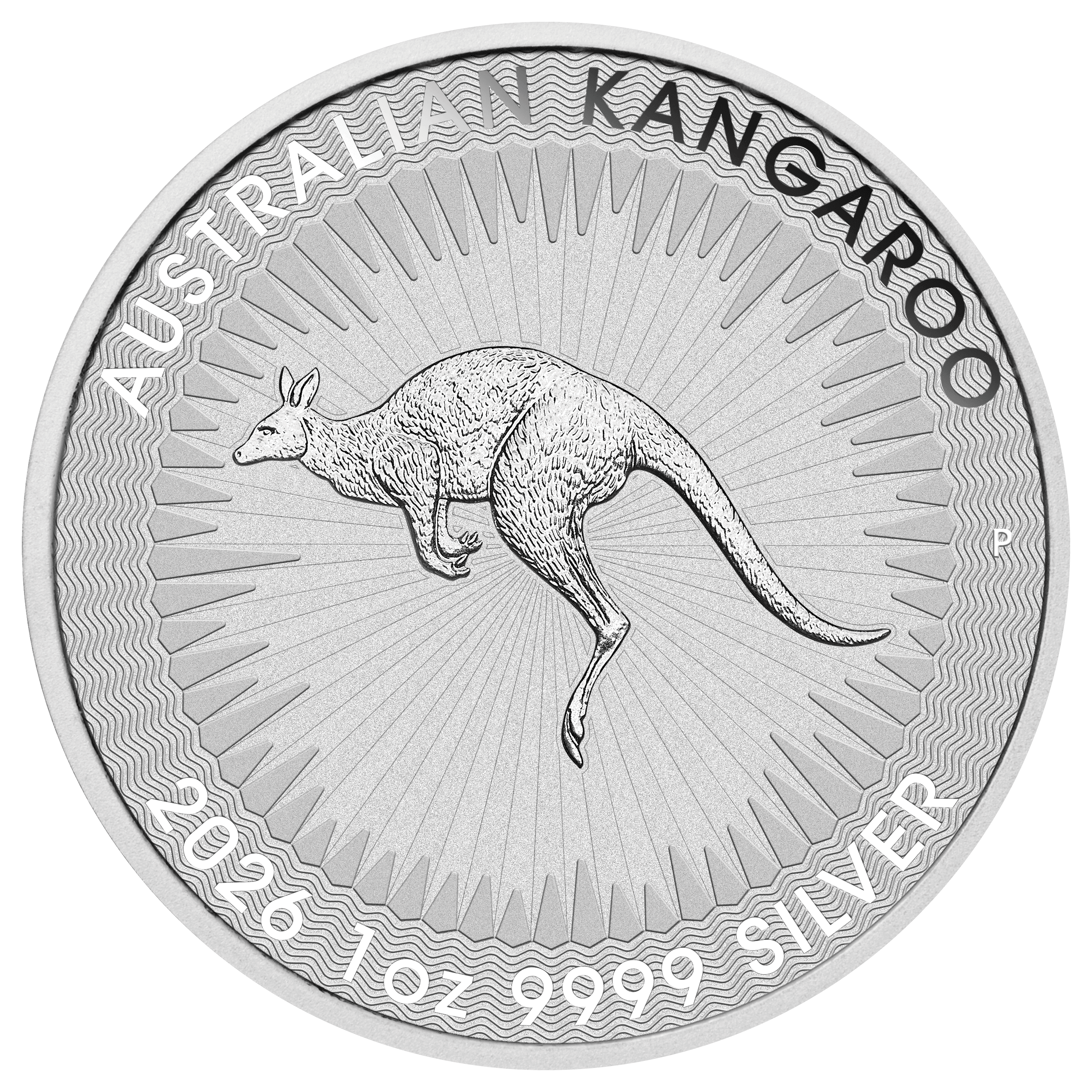 The reverse of the silver kangaroo coin depicts a bounding kangaroo surrounded by stylised rays of sunlight. Inscriptions on a wavy-lined border include ‘AUSTRALIAN KANGAROO’ and the coin’s weight, purity, the 2026 year-date, and The Perth Mint’s ‘P’ mintmark.