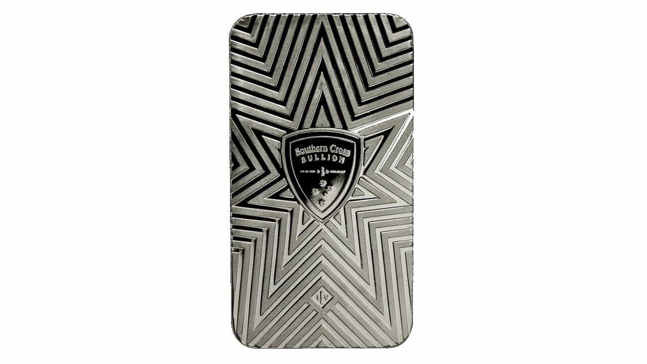 The back features the Southern Cross Bullion shield at the center of a stunning star pattern stamped deeply into the hard metal.