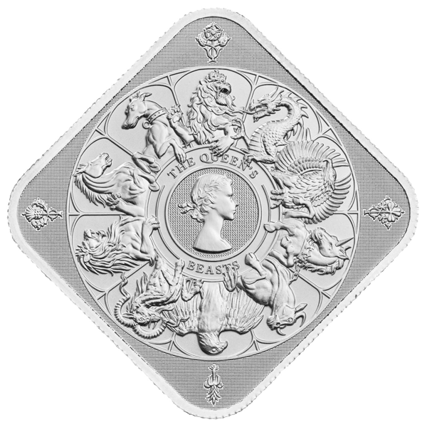 The Queen’s Beasts are ten heraldic creatures that symbolise the royal ancestry of Elizabeth II. As the world watched the coronation of the young queen in 1953, the beasts stood guard as statues outside Westminster Abbey. To honour the longest-reigning monarch in British history, The Queen’s Beasts have been brought together on this square bullion bar that includes Mary Gillick’s coinage portrait of Elizabeth II at its centre.