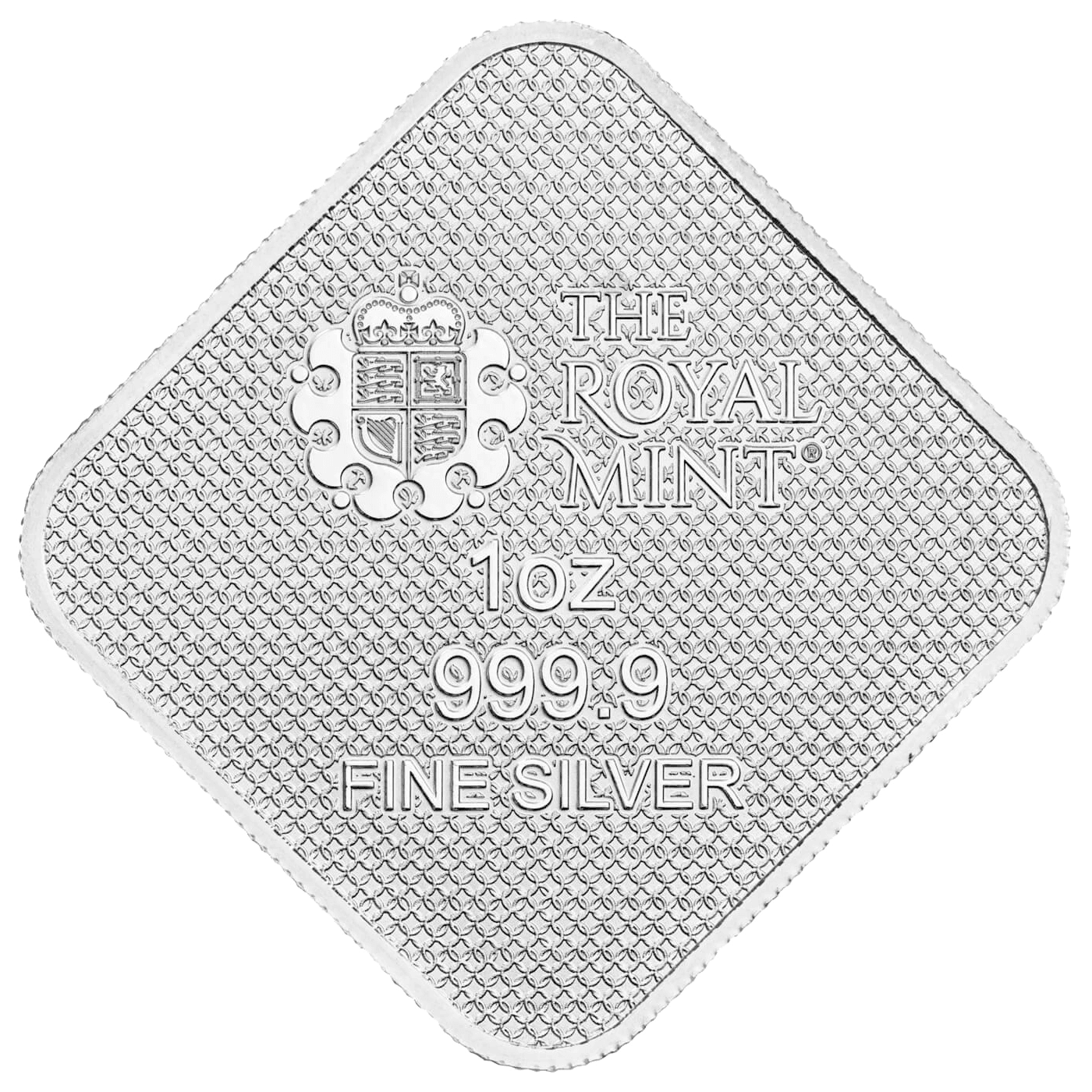 The obverse features the The Royal Mint logo as well as the weight and fineness on top of a chain mail patterned background.