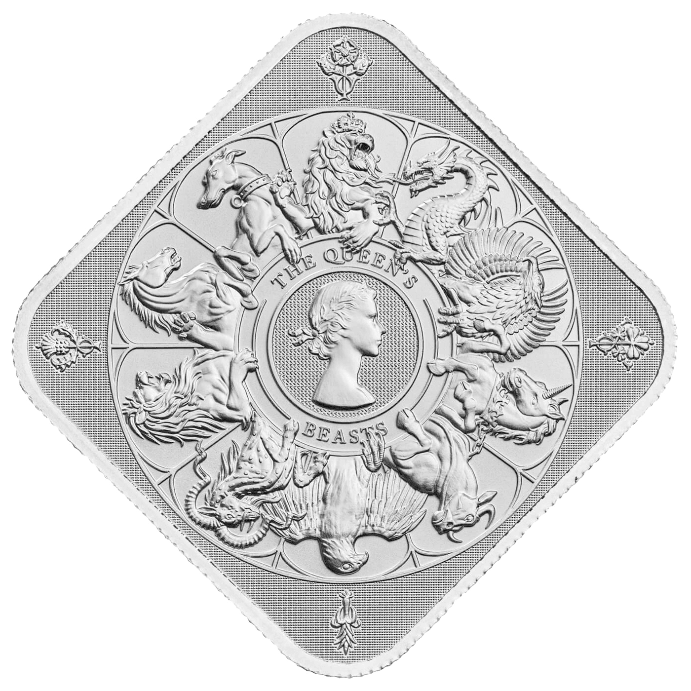 The Queen’s Beasts are ten heraldic creatures that symbolise the royal ancestry of Elizabeth II. As the world watched the coronation of the young queen in 1953, the beasts stood guard as statues outside Westminster Abbey. To honour the longest-reigning monarch in British history, The Queen’s Beasts have been brought together on this square bullion bar that includes Mary Gillick’s coinage portrait of Elizabeth II at its centre.